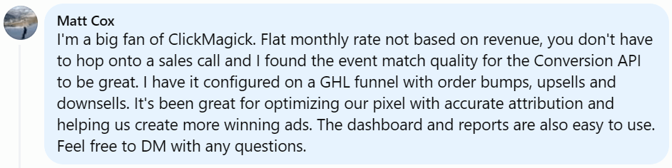 “I'm a big fan of ClickMagick. Flat monthly rate not based on revenue, you don't have to hop on a sales call and I found the event