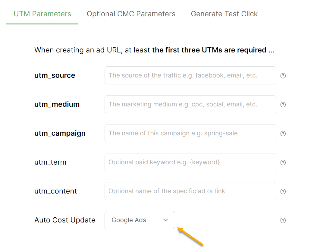 On the other hand, if you’re using the URL Builder, just select your ad network for the Auto Cost Update setting and you’ll see a new cmc_adid parameter added to your URL.
