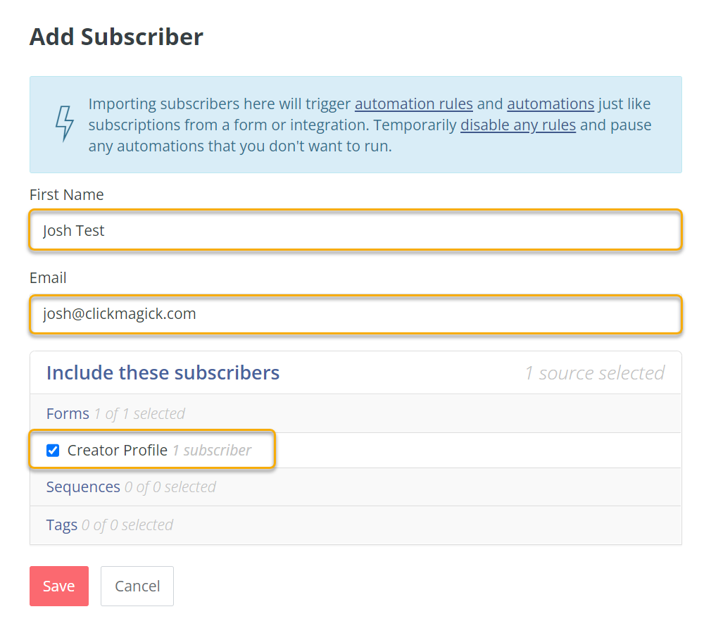 3. Fill in the information with your own data for now, and then make sure to add the new subscriber to either a form, sequence, or tag.