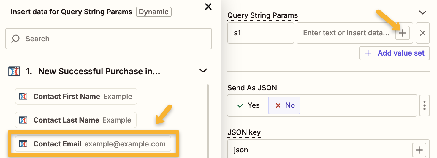 Next, under “Query String Params”, enter s1 into the first box. Then click the “+” icon next to “Enter text or insert data”.