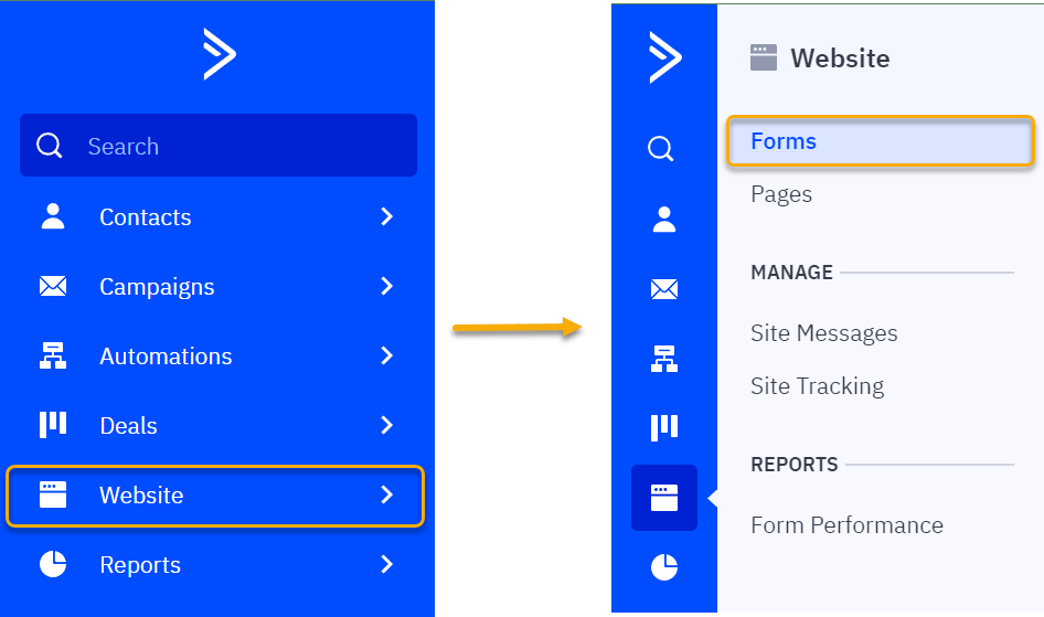 1. In ActiveCampaign, click on the Websites menu and then click on “Forms”