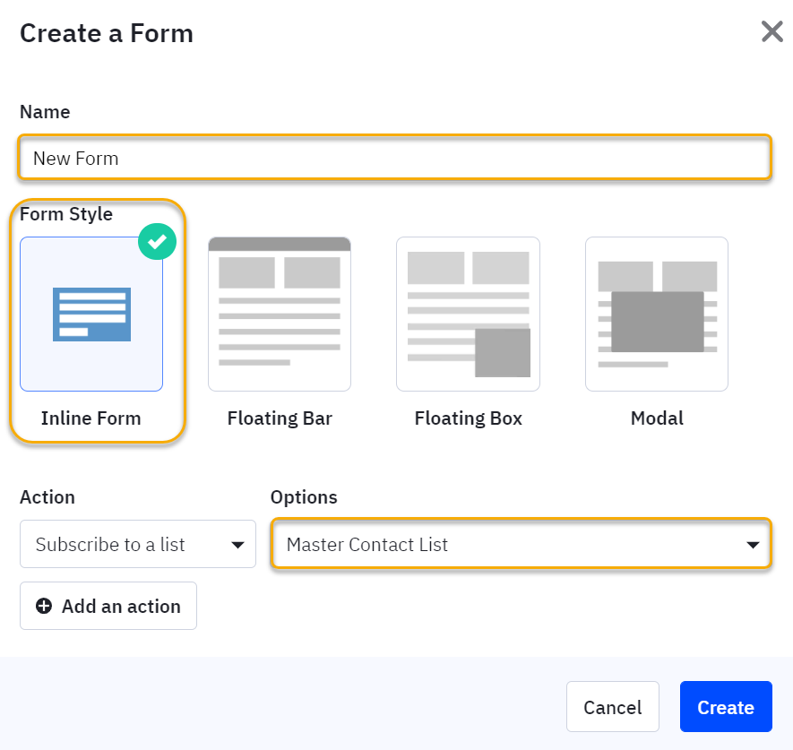 3. Once the form creation window pops up, give your form a name, choose the inline form, and select the correct list in the “Options” dropdown.