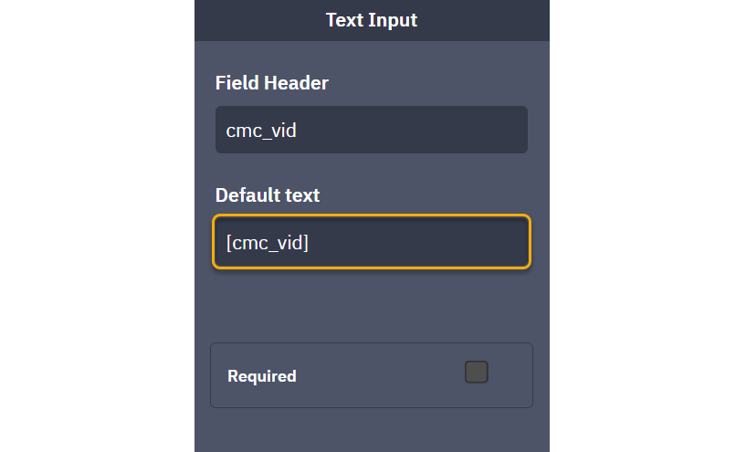 7. In the field settings, also labeled “Text Input,” you may need to add a piece of default text. If that box is blank, add [cmc_vid] to that box.