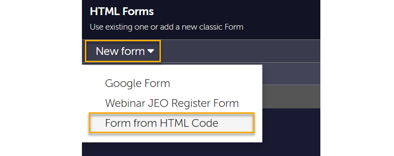 3. Click on “HTML Forms”, then “New Form”, and then “Form from HTML Code”.