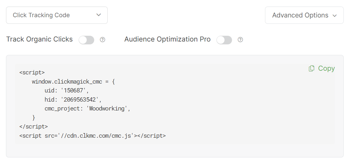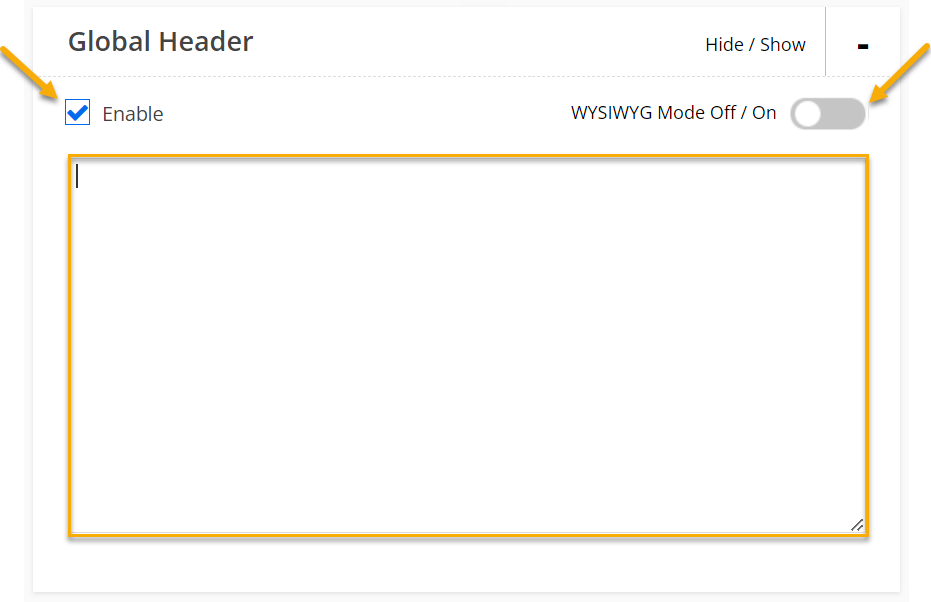 4. Add your Click Tracking Code to the “Global Header” box. You also need to check the box to enable the header and turn off the WYSIWYG mode for it to work properly.