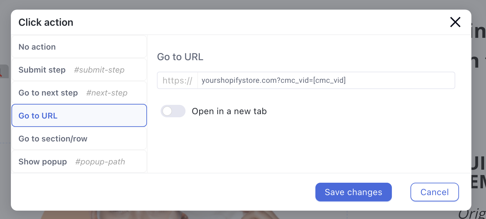 In the "Click action" pop-up, paste the updated URL with the Visitor ID (cmc_vid) parameter and token added in the "Go to URL" field, and click "Save changes".