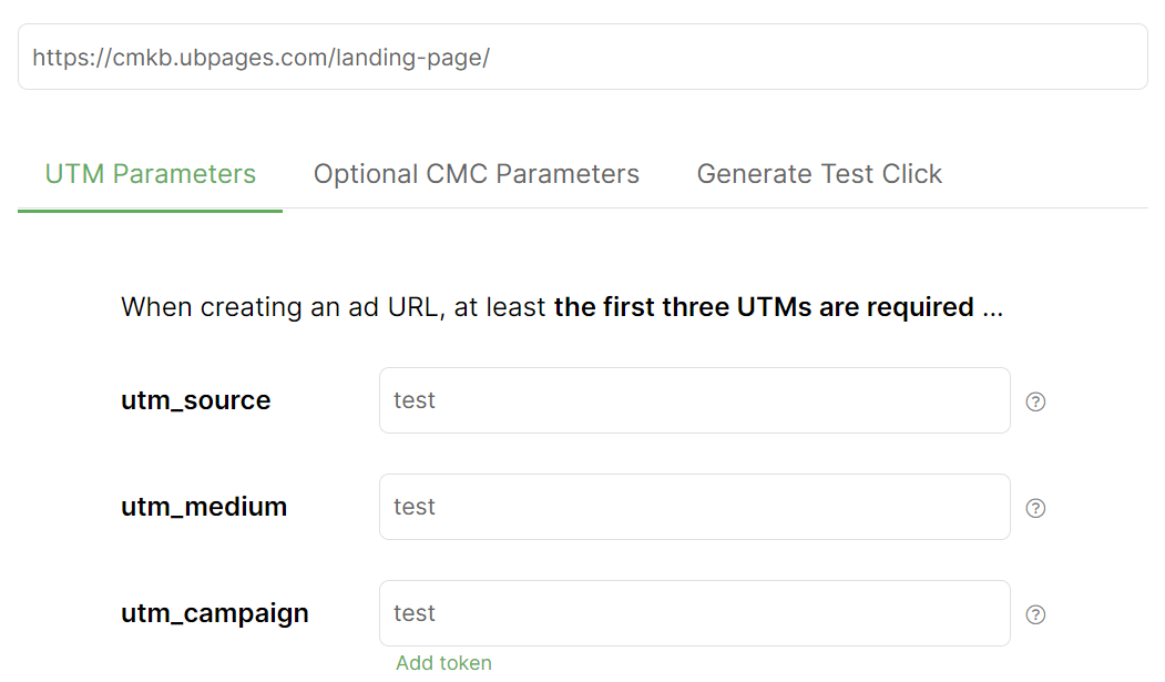 6. Paste the URL of your landing page into the box, and give the first three parameters the value “test” as what we put here at this point doesn’t actually matter.