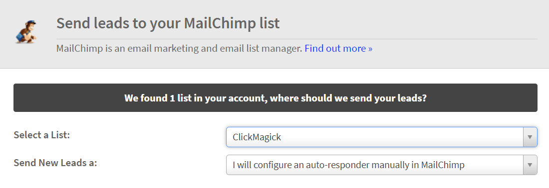 13. Choose the list that you want the leads to be generated into from this form, and then choose to configure an auto-responder manually in Mailchimp.