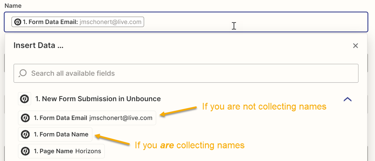 For this article, we are not collecting names, so we are selecting “Form Data Email” so that way there is a value here.
