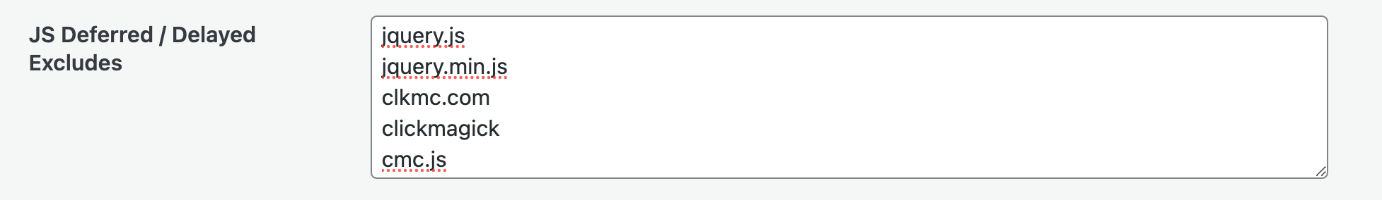 4. Paste the exceptions you copied above into the “JS Excludes” and “JS Deferred / Delayed Excludes” boxes.
