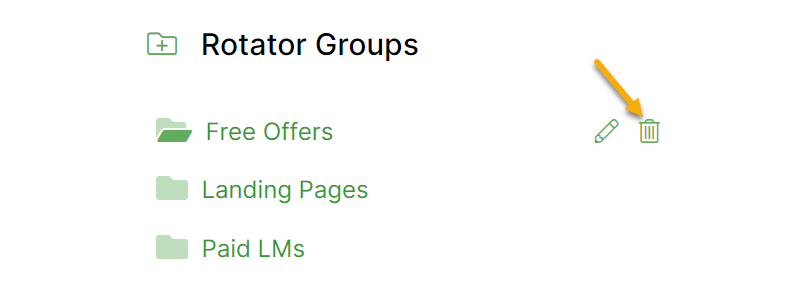To delete a rotator group—which does NOT delete the rotators themselves—go to the Tools menu at the top of every page and select the Group Manager. From there, click on the rotator group you want to delete, and a trash can icon will show up next to the group name. Click on the icon to delete the group.