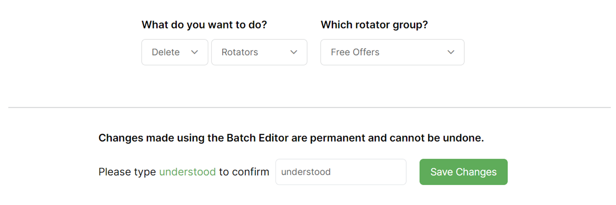 If you want to delete a rotator group and all of the rotators within it, the easiest way is to go to the “Batch Editor” in the Tools menu, choose “Delete”, then “Rotators”, and the rotator group you want to delete.