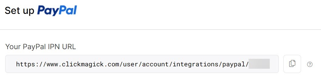Navigate to your ClickMagick Integrations page, click the “Set up PayPal” button, and copy your PayPal IPN URL at the top of the screen, which you’ll need in the next step.