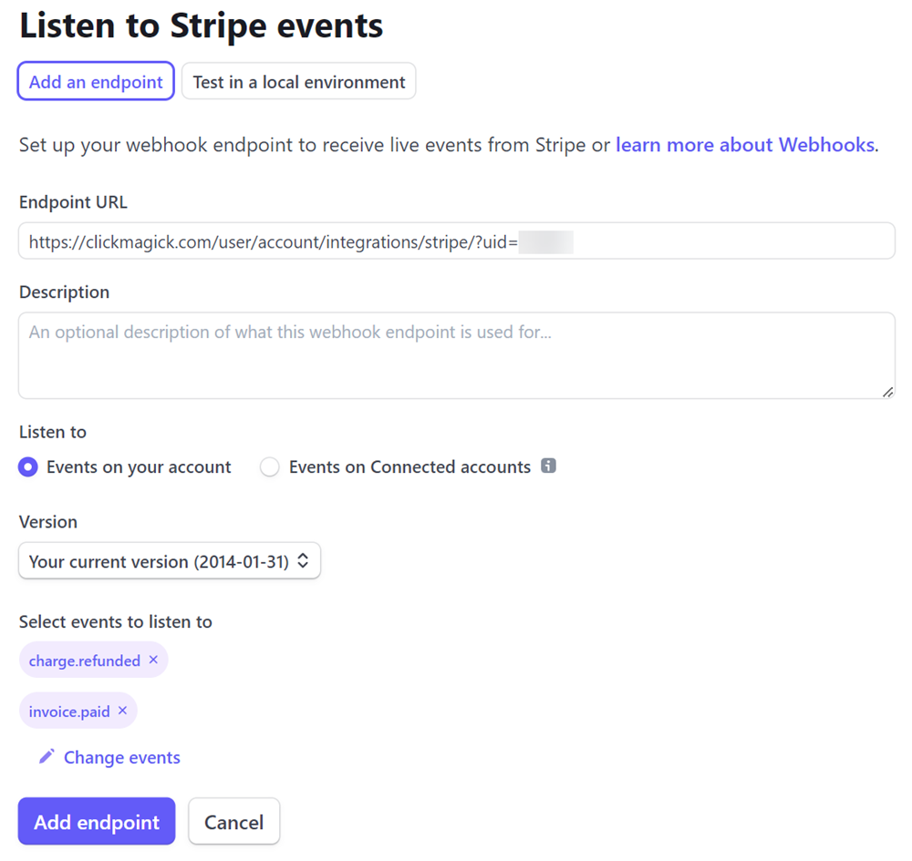 Step 3 – Add a new ClickMagick Endpoint in Stripe