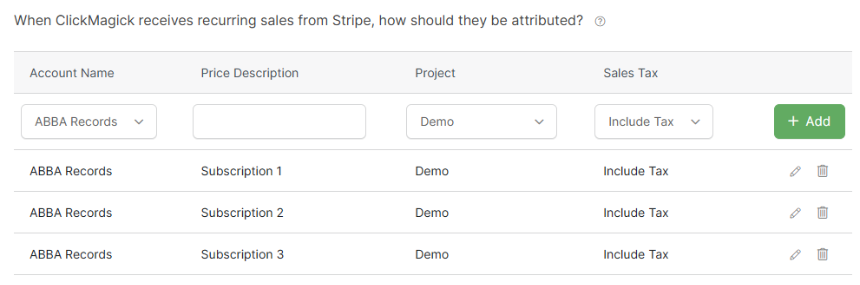 For each subscription plan that you have, select the Stripe Account Name, enter the exact “Price Description” from Stripe, select the ClickMagick project you want recurring revenue to be attributed to, and select whether you want to include or exclude tax in the recurring revenue amounts.