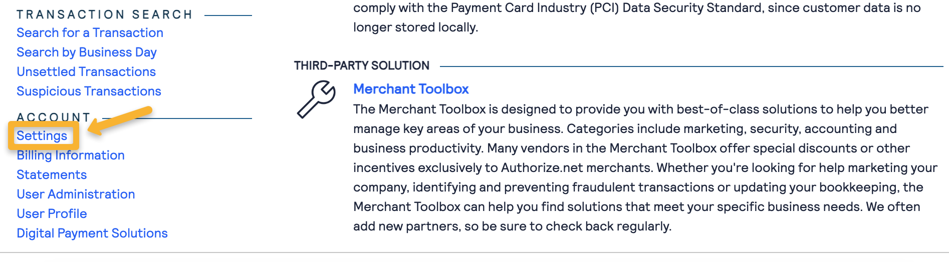 Go back to the “Home” page of your Authorize.net account and click on “Settings”.
