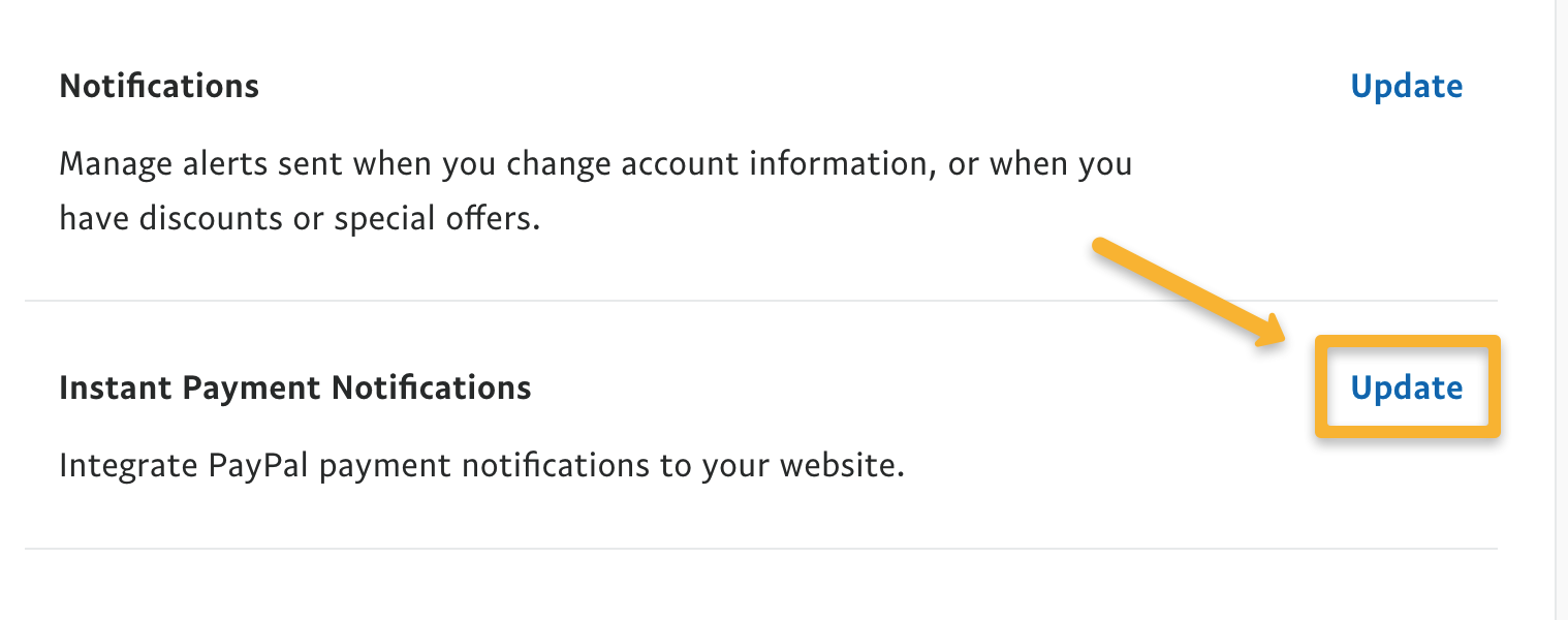 Next, click on “Notifications”, then “Update” next to “Instant Payment Notifications”.
