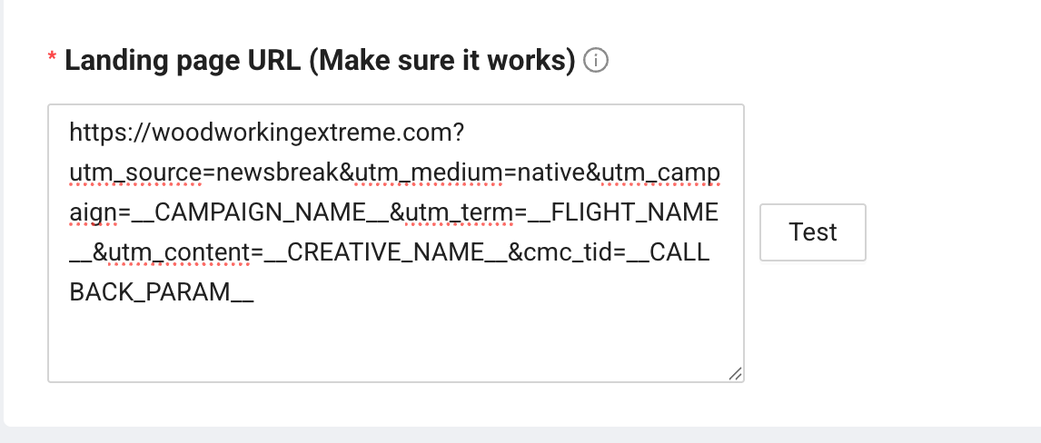 In Newsbreak, after creating a Campaign you'll want to add your URL when creating your ad: