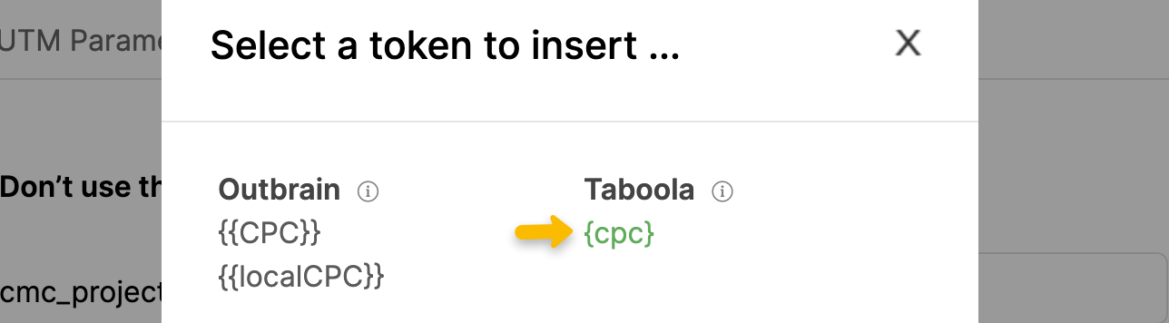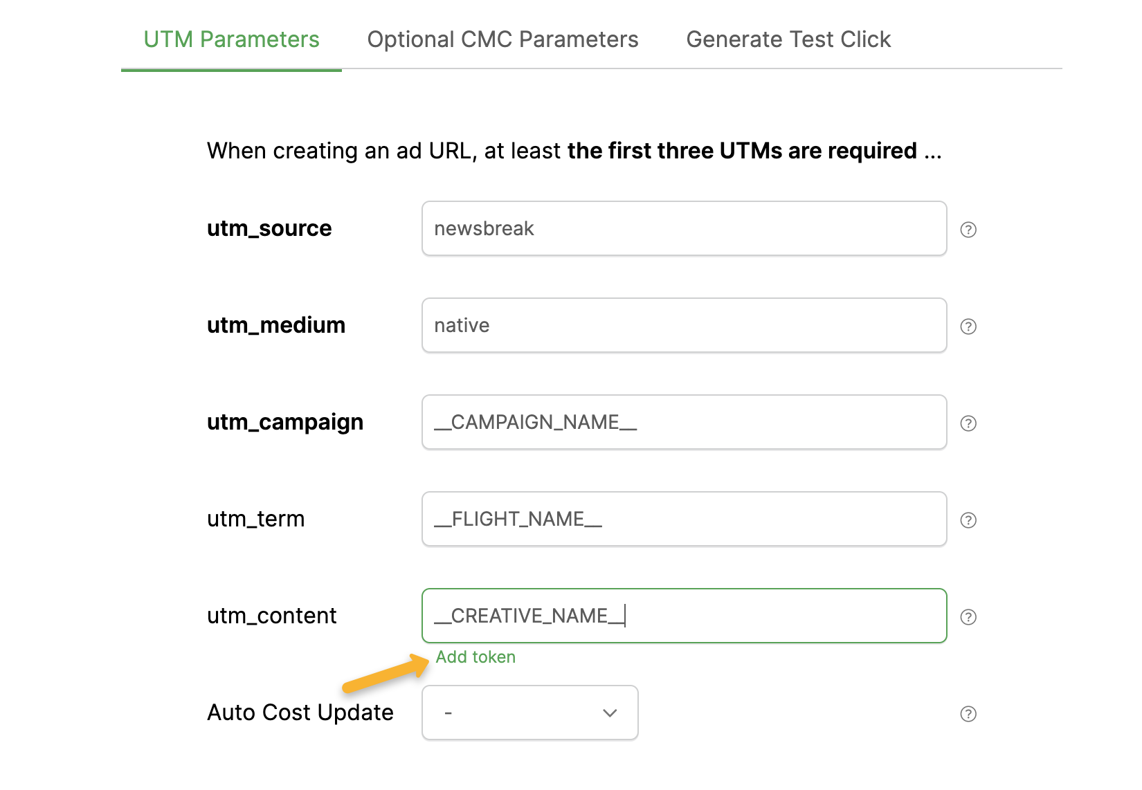 To track your ad spend with Taboola, click to the “Optional CMC Parameters” tab of the URL Builder, then under the cmc_cpc field click on “Add Token”.