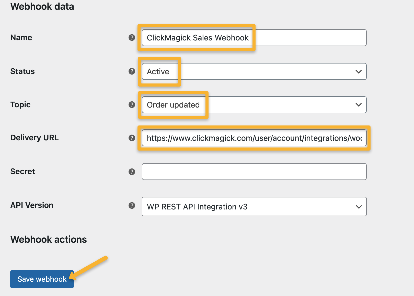 2. If you have multiple WooCommerce stores under different projects that may share the same customers, you’ll need to add &cmc_project=yourprojectname to your webhook URL too. This makes sure the sale always gets attributed back to the correct project, even if that customer visited more than one of your stores. Like so: