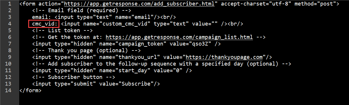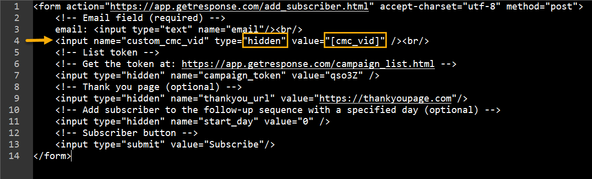 9. Then, in that same line, update “text” to be “hidden”, and then add the value “[cmc_vid]”. An example is below: