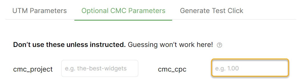 If you want to pass in the cost with each click, either an estimated CPC or the actual CPC if you know what it is, you can add an optional cost parameter to your UTM-powered URL and the cost for each click will be recorded automatically.