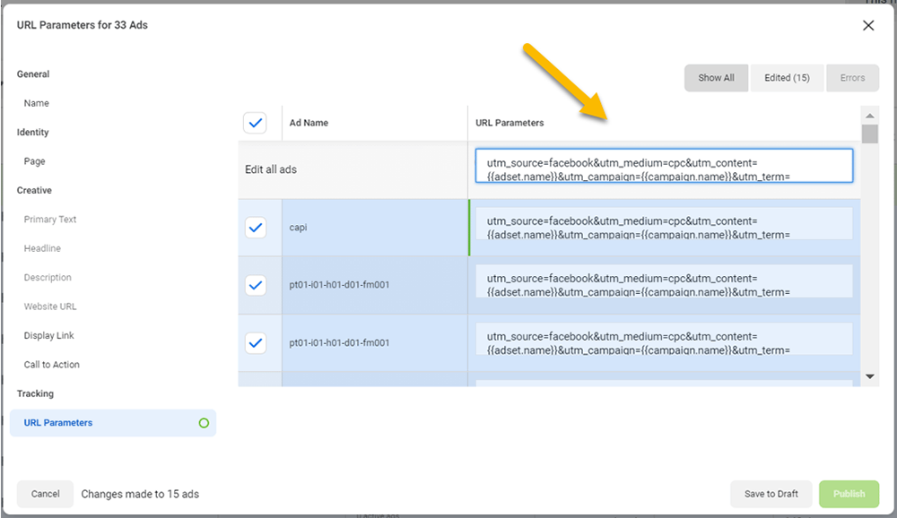 If you have lots of ads and adding tracking parameters to each ad individually isn’t practical, you can sometimes use a “Tracking Template” at the campaign or ad set level which will be automatically applied to all your ads.