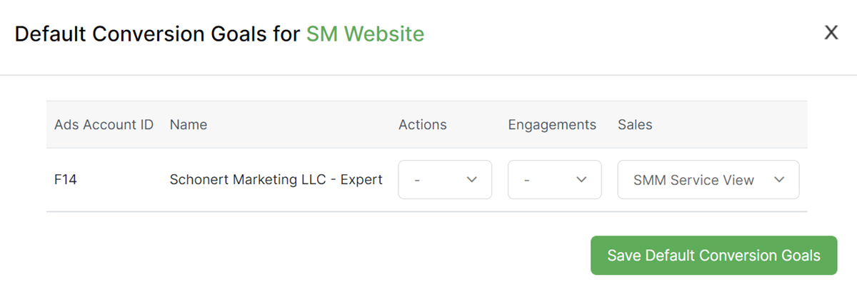 The Default Conversion Goals allow you to specify a single Conversion Goal for each of Actions, Engagements, and Sales with a single Project.