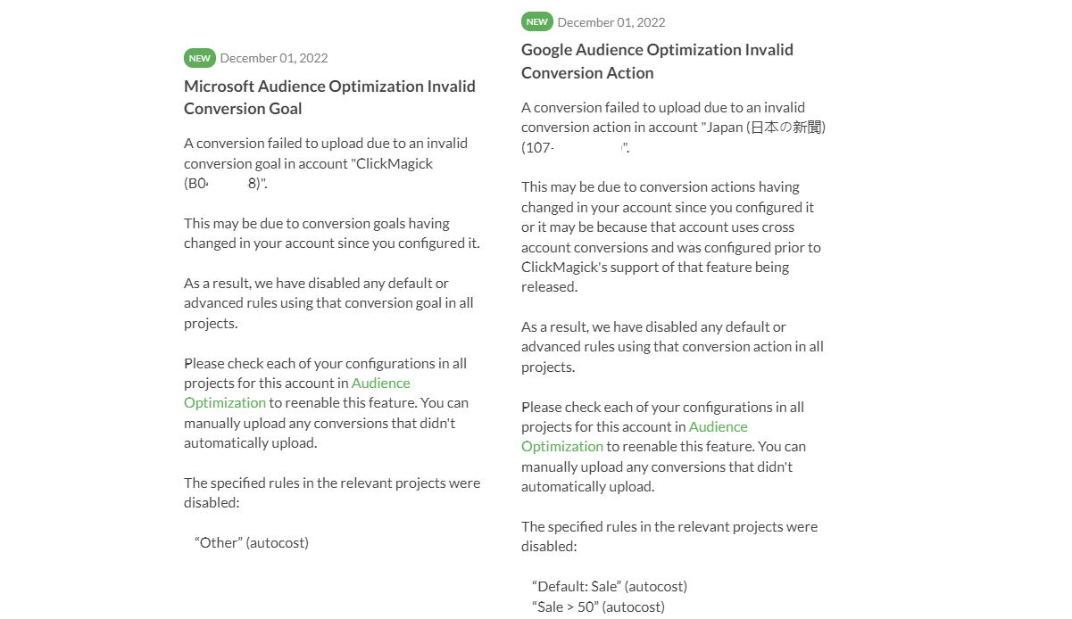 When you are reviewing your Audience Optimization logs, you may come across a couple of different error messages related to conversion actions.
