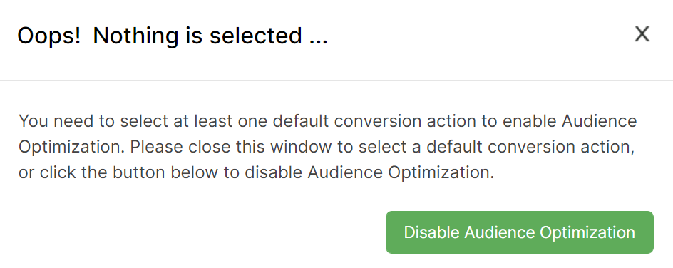 When working with the Default Action (Google Ads) or Default Goal (Microsoft Ads), it is required to have at least one default set up in order to keep Audience Optimization active for the specific ad provider.