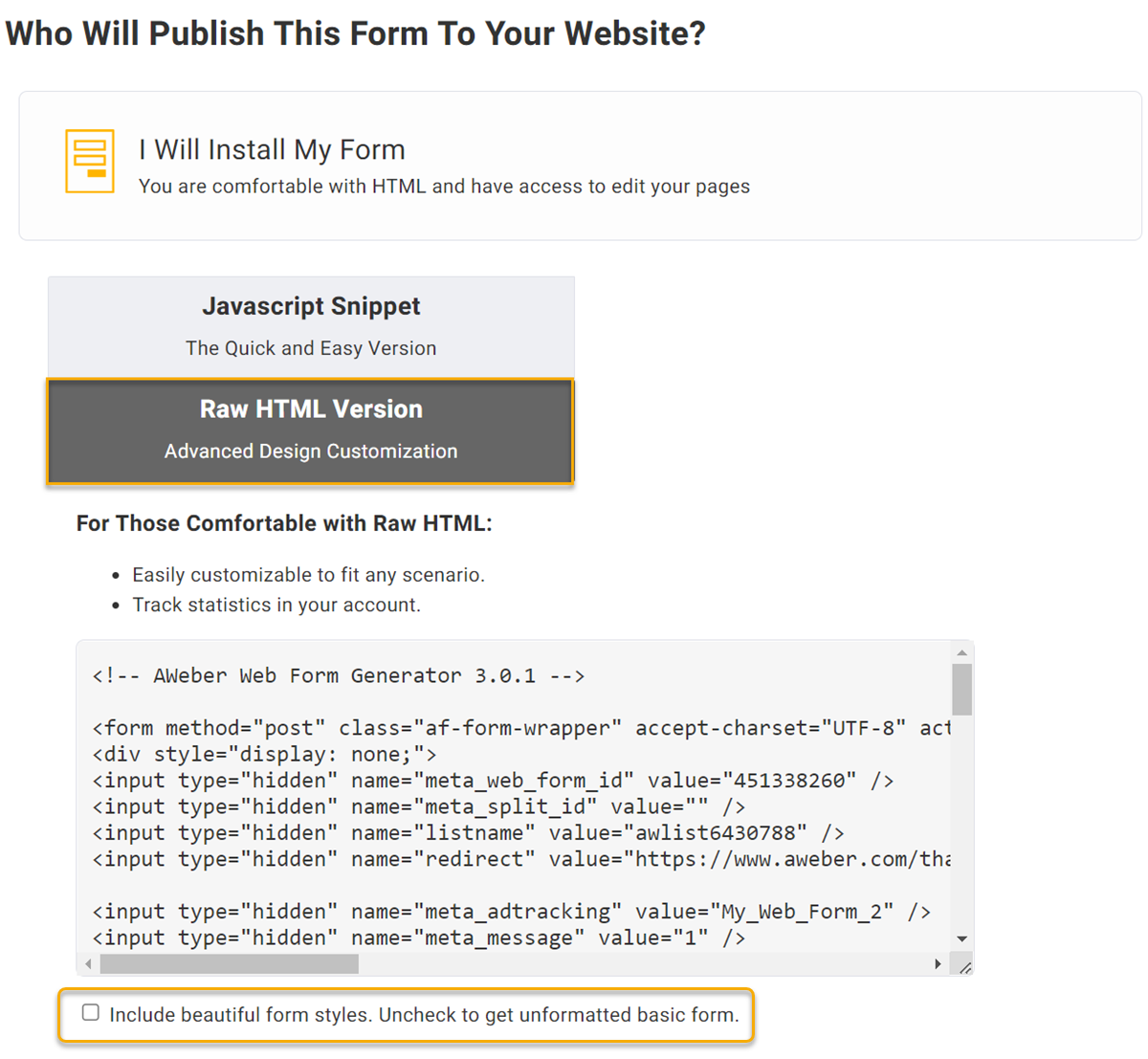 5. Click on the “Go To Step 3” button and then choose the option “Raw HTML Version”. Then, ensure you uncheck the box that states “Include beautiful form styles”.