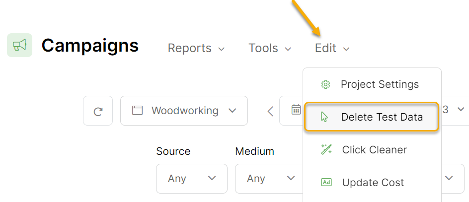 For Projects, remember to select “Delete Test Clicks” from the Edit menu before testing something you’ve already tested and need to test again. This will remove all the test clicks and conversions that you’ve generated on your own site, which are highlighted in your click and conversion logs.
