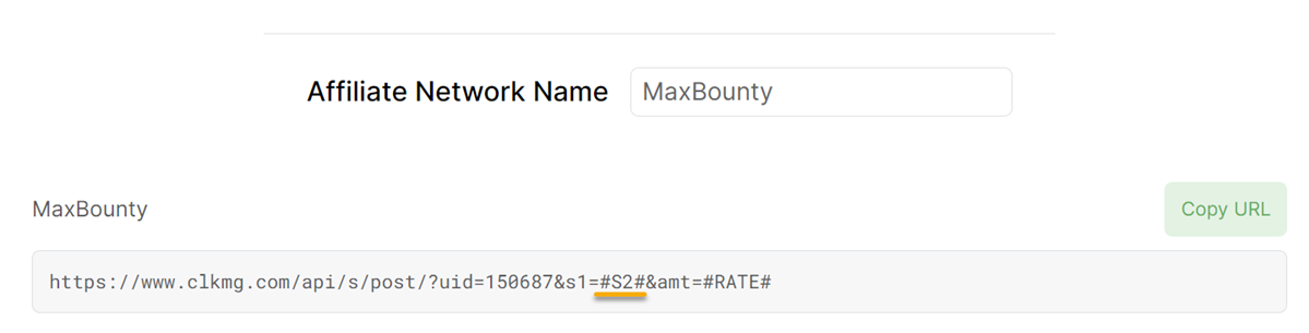 Here’s the entry for MaxBounty, showing that they want you to use the #S2# token for their network (use whatever comes after s1= but before the next &):