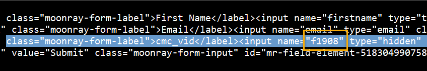 4. In your custom form code, find the line where you see your custom cmc_vid field referenced, and look for something that says “Input name”, like this: