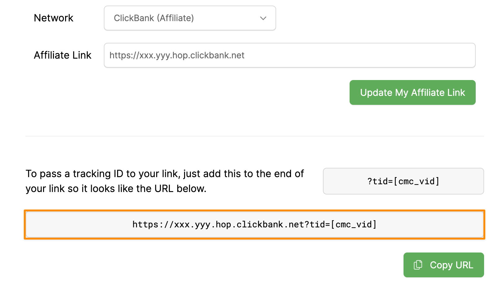 Next, select your affiliate network from the menu, paste your affiliate link into the box, and click on the “Update My Affiliate Link” button.