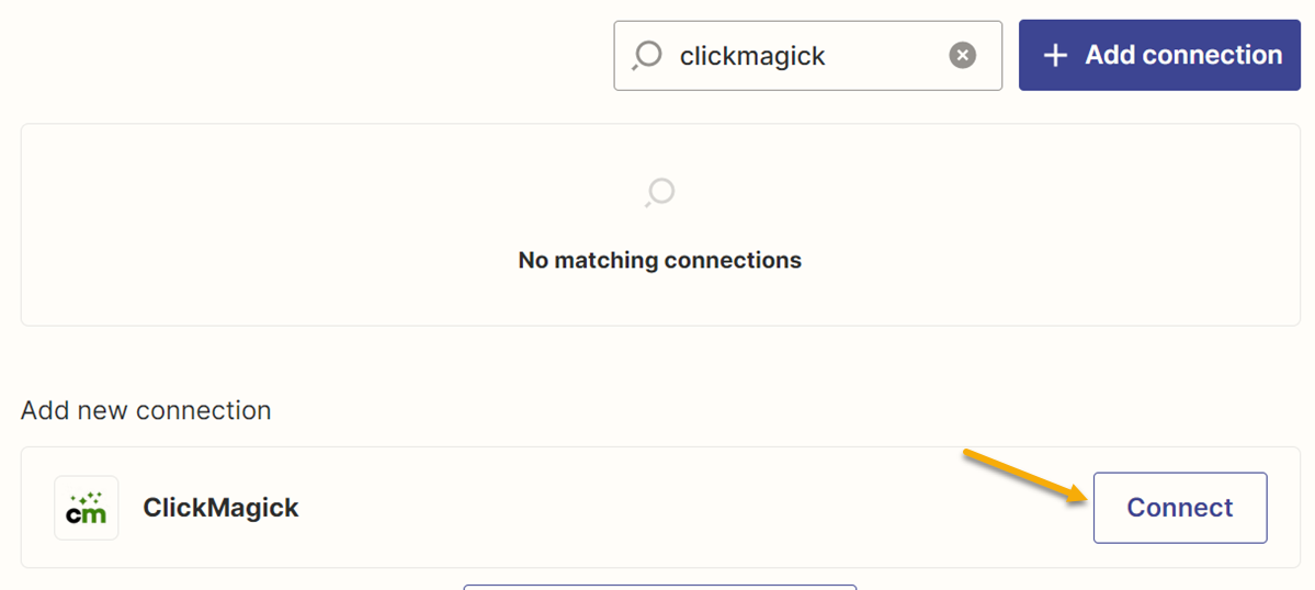 On the “Apps” page you’ll want to click on the “+ Add connection” button and do a search for ClickMagick: