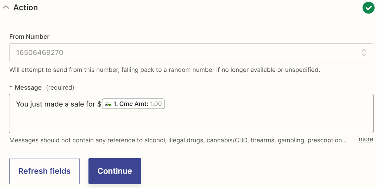 Once you’re signed in, choose the “From Number” you wish to receive messages from and add in the required message. (Zapier provides you with a list; you can choose random, or choose a specific number so it’s consistent.)