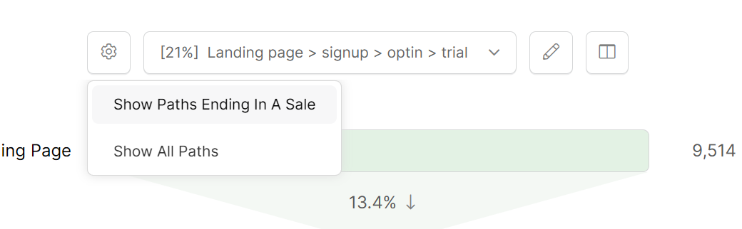 By default you’ll see all paths that end in a Sale, which have also received at least 1% of your traffic. This allows you to focus on what are probably the most important paths in your funnel.