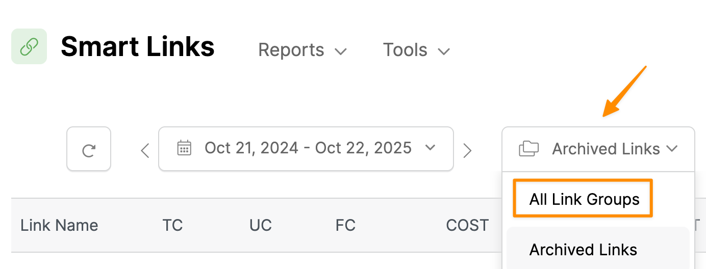 To fix this, simply click on that group dropdown and select the group you want to select, or select “All Link Groups” to see all your links: