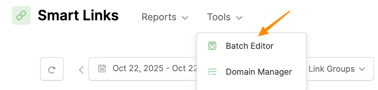 The Batch Editor is located in the Smart Links or Rotators Tools menu and can be used to make bulk changes to multiple links, rotators, or rotator URLs at the same time.