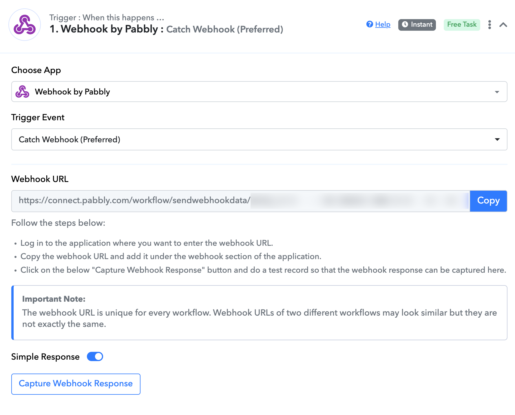 Next, we’re going to add a trigger. Select “Webhook by Pabbly” and “Catch Webhook” as the trigger event.