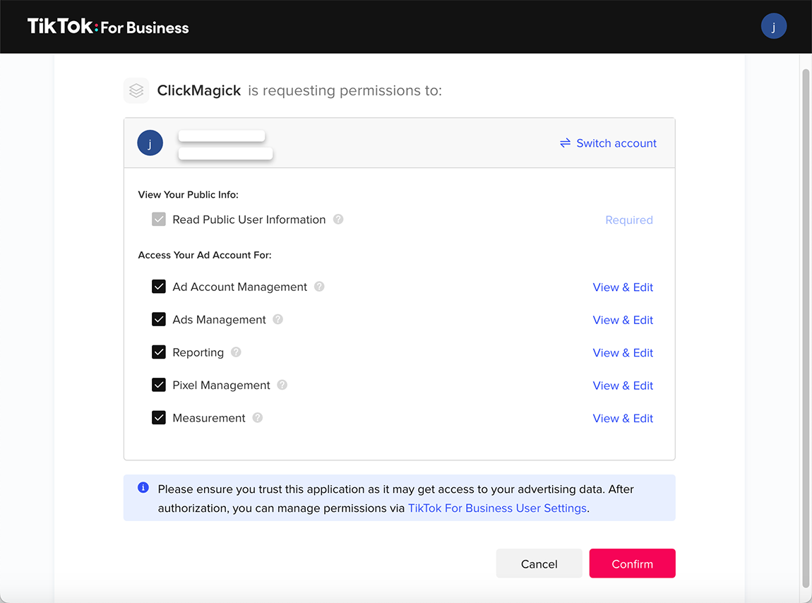 Follow the prompt and click “Confirm” to continue and select the ad account you want to integrate. Make sure to select all check boxes as shown in the image below.