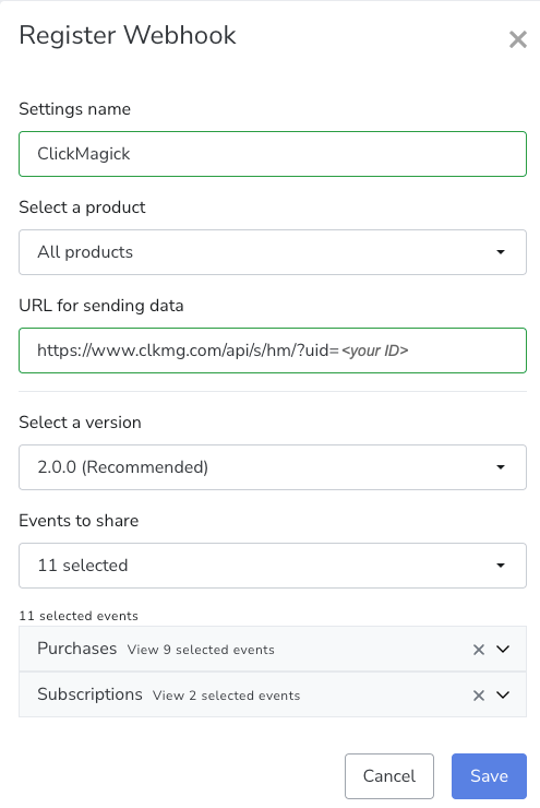 After entering your data into ClickMagick, the Hotmart integration page should look similar to this: