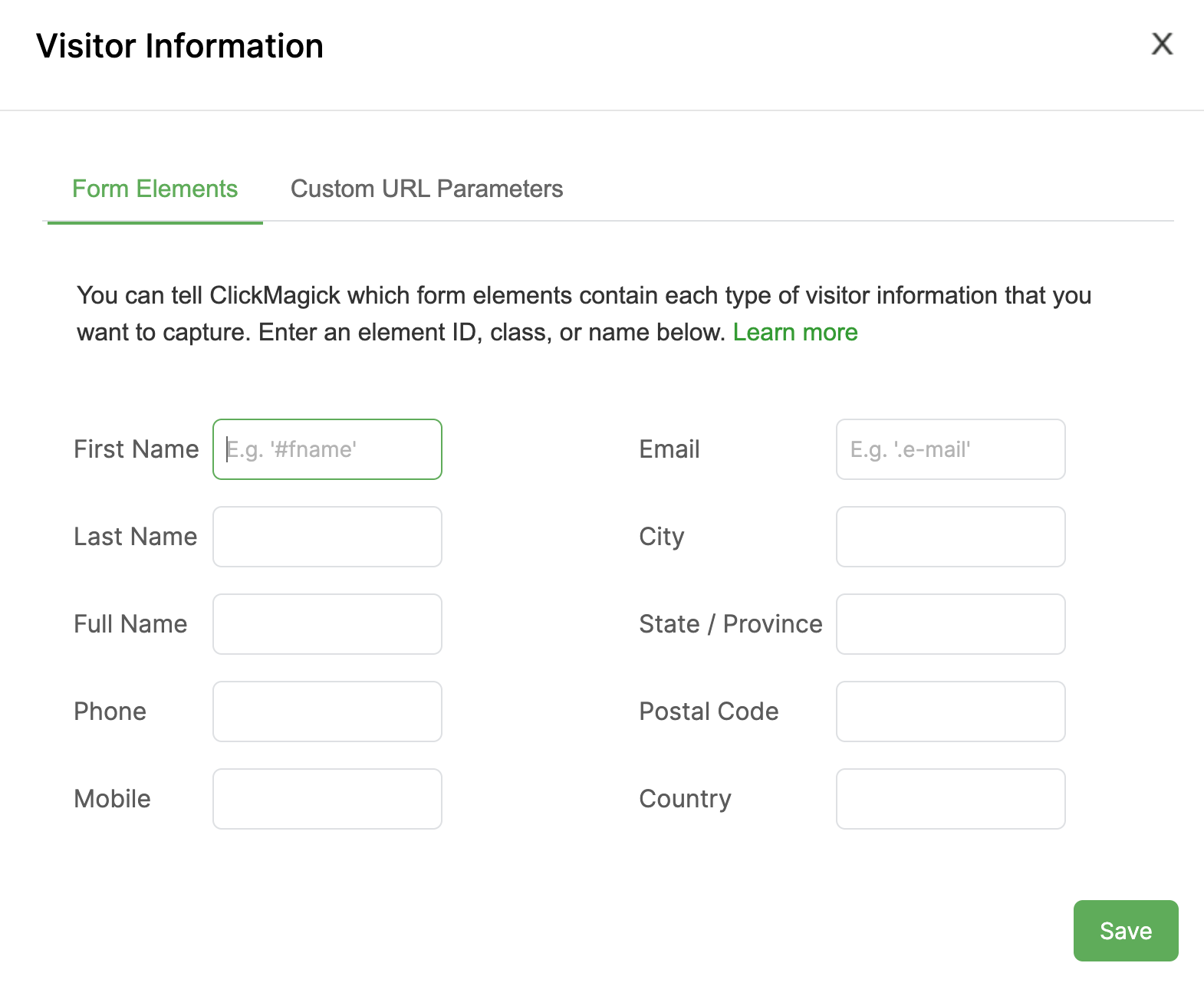 For each type of Visitor Information, simply enter the custom parameter name for each piece of information exactly as it will appear in the URL.