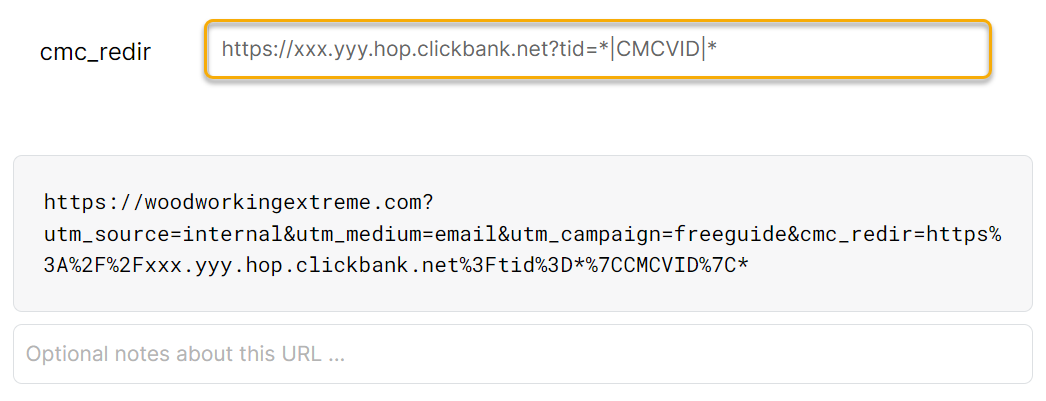Add the affiliate link you modified above to the cmc_redir field and then copy your URL.