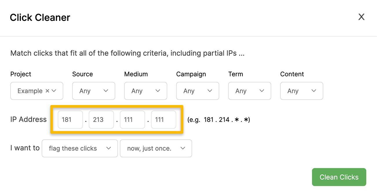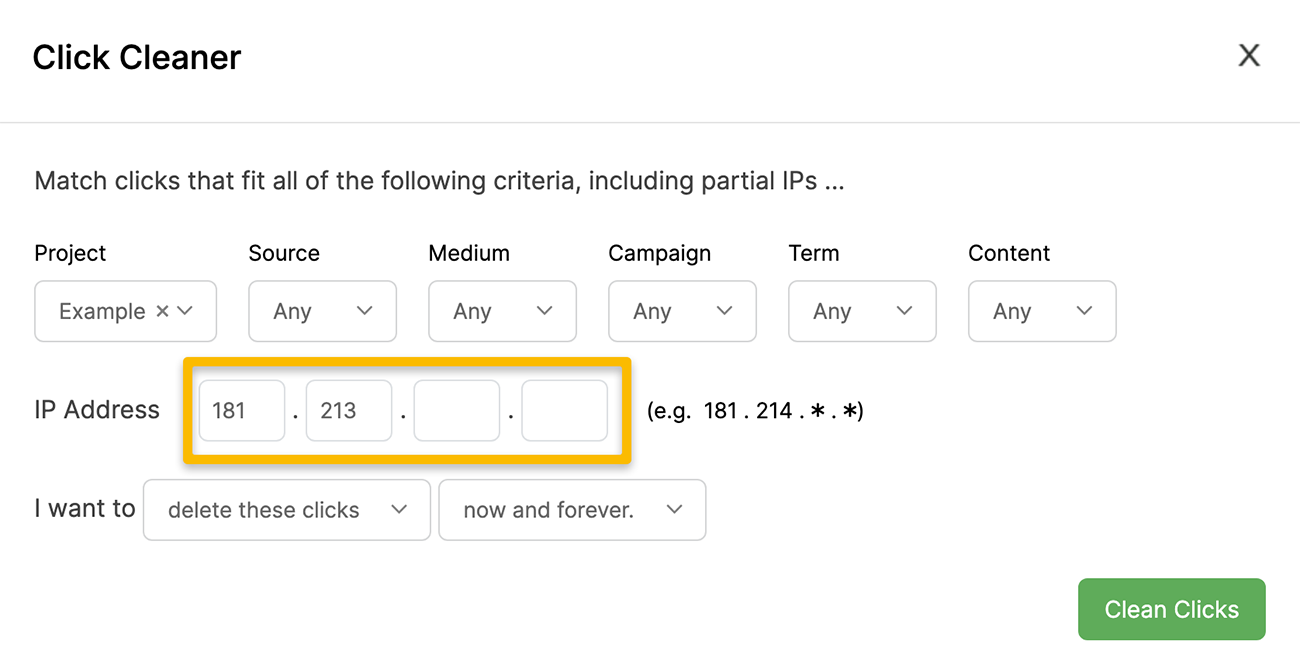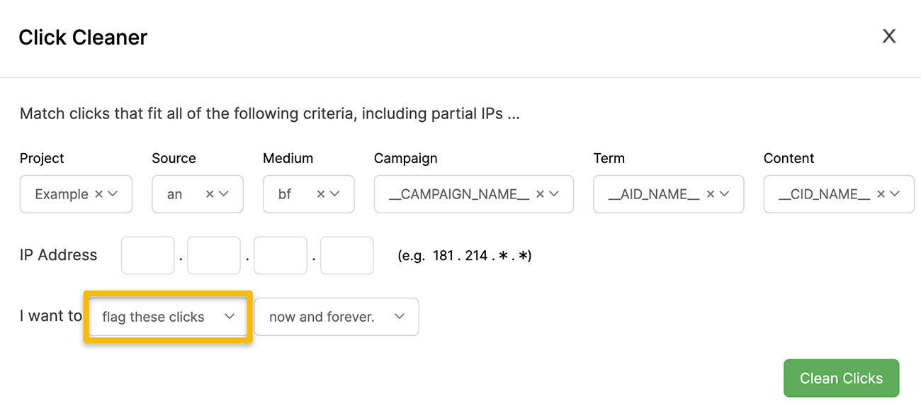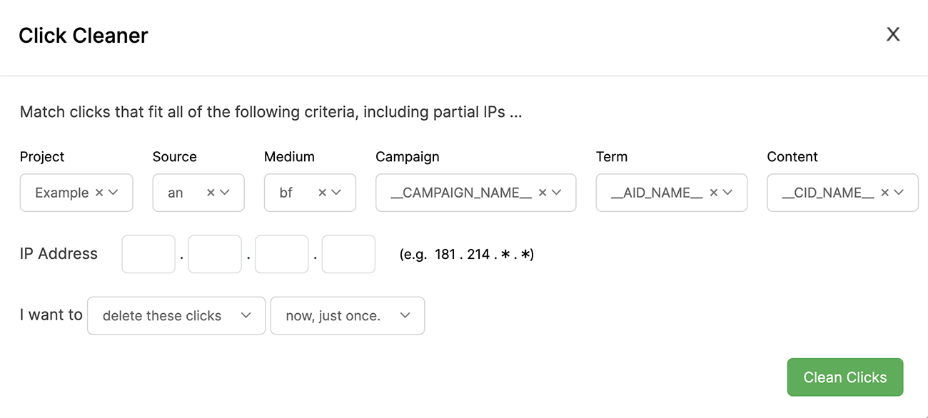 Click Cleaner is a convenient tool that allows you to easily remove clicks you don’t want included in your stats, based on either UTMs or IP addresses. You can also set up rules to “rewrite” the UTMs for clicks you don’t have control over.