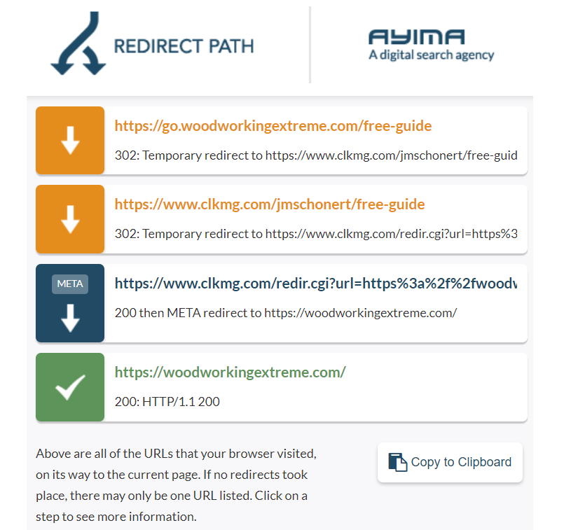 If you’re using a tool like the Redirect Path extension for Chrome—which we highly recommend—you can check whether your URL redirects through other URLs before landing on the final page. Multiple redirections is generally the reason why pages load slowly.