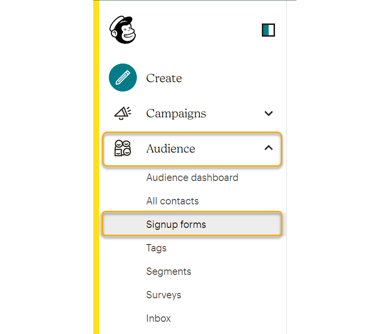1. In Mailchimp, click on the Audience menu and choose “Signup forms.”