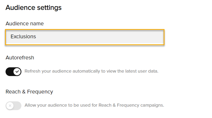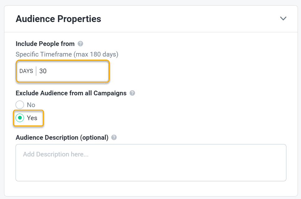 6. Set the time frame you want to included people (The default is 30 days, but you can set any number up to 180), and then change “Exclude audience from all campaigns” to YES.