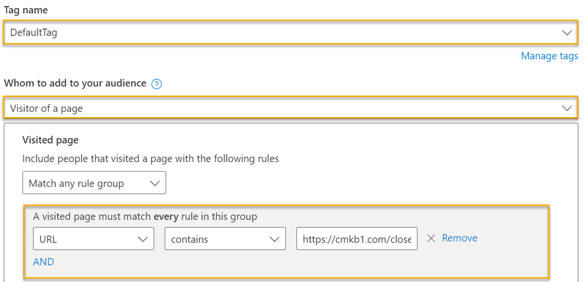 12. Click on the “Add Rule” button, and then fill in the details. Make sure to use the same URL in the box here as you did in your remarketing list you added in Microsoft Ads.